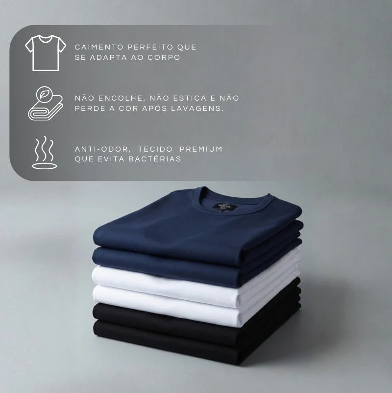 A camiseta da MONSIEUR™ mantém aparência de nova por muito mais tempo, com tingimento de alta durabilidade que não desbota mesmo após muitas lavagens. Não precisa passar: o tecido não amassa, fica alinhado o dia todo e garante praticidade com visual sempre impecável.